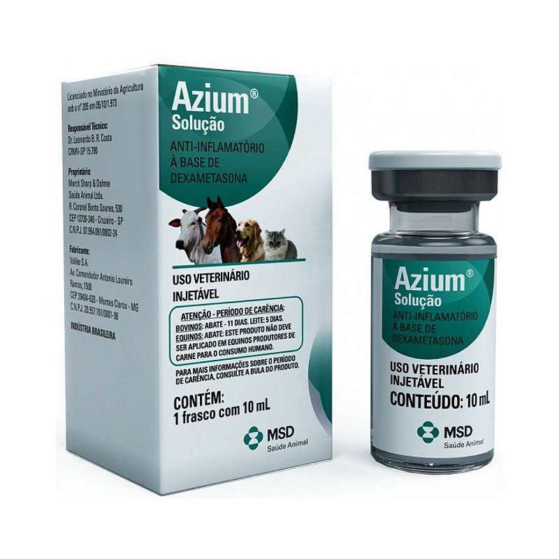 Azium Solução 10 mL da MSD é um anti-inflamatório à base de dexametasona indicado para uso intramuscular ou intravenoso em animais. É utilizado sempre que for necessária uma resposta hormonal imediata, em casos de inflamação, alergia, choque ou toxemia.