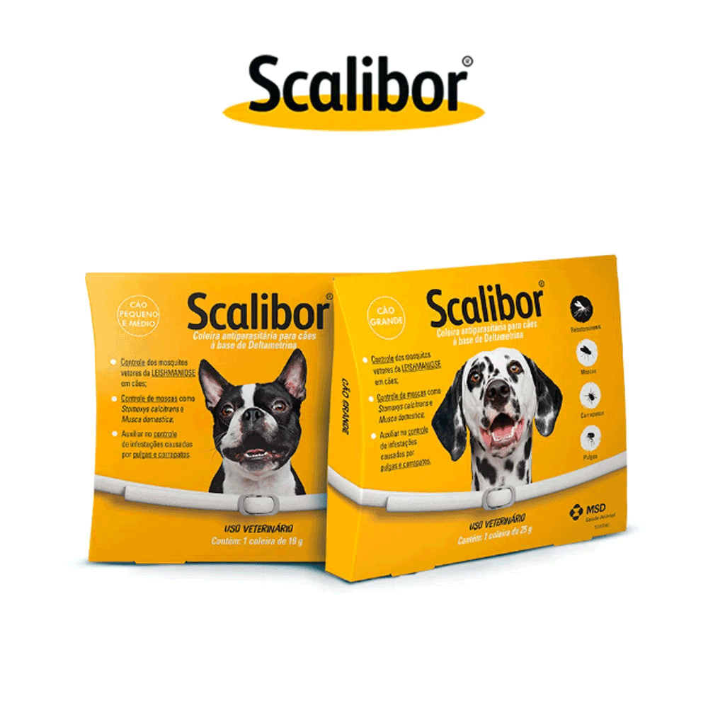 Scalibor® é uma coleira antiparasitária que possui elevada eficácia contra pulgas, carrapatos, moscas e mosquitos, inclusive o transmissor da Leishmaniose, contribuindo para a segurança do seu cão e da sua família.