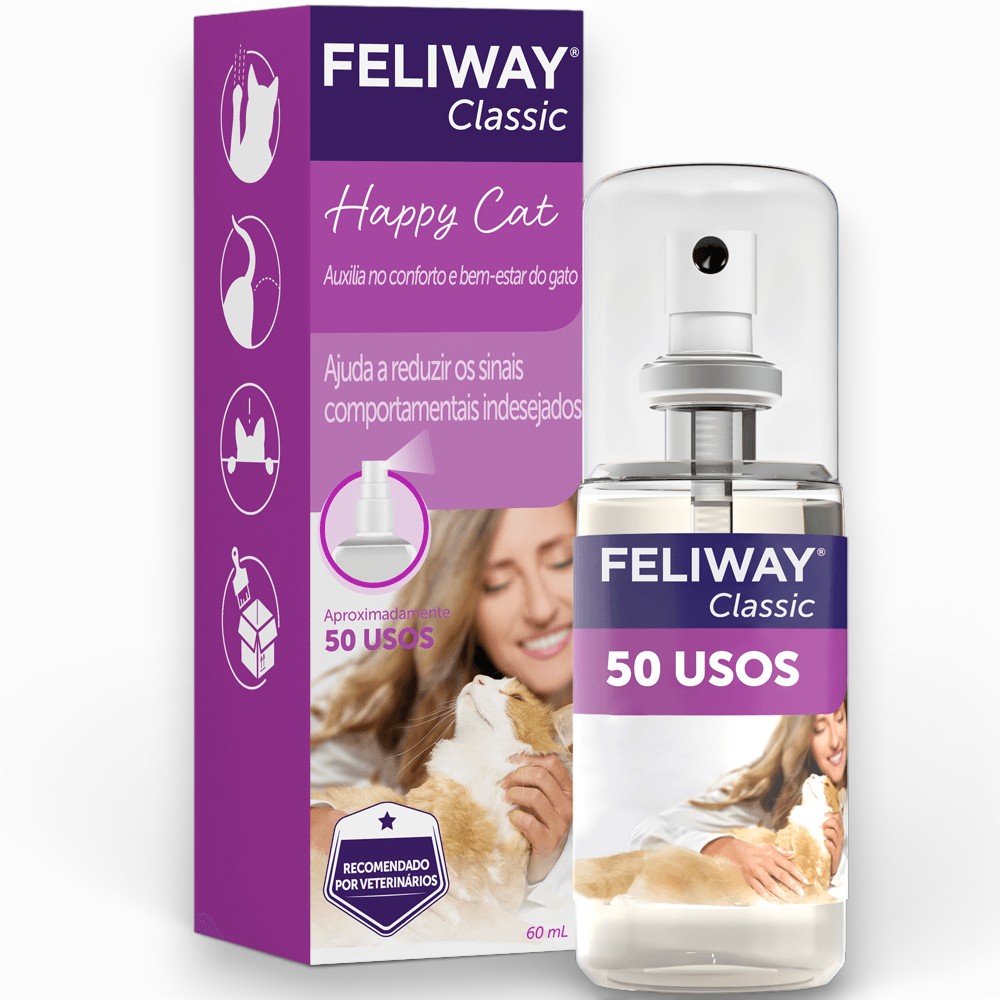 O Feliway Spray 60ml é um produto à base de feromônio sintético facial felino, indicado para auxiliar na redução do estresse e de comportamentos indesejados em gatos, como marcação urinária, arranhaduras excessivas e ansiedade em viagens.