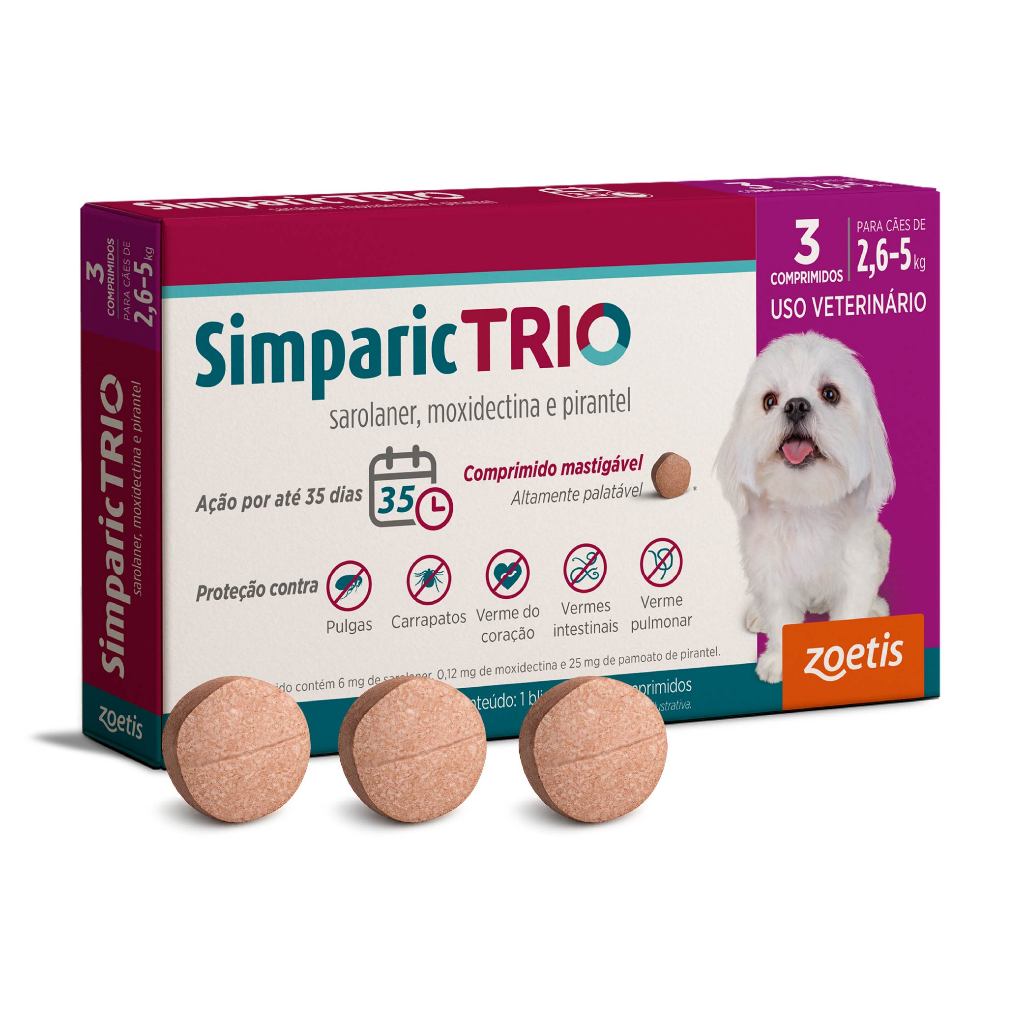 O Simparic TRIO é um comprimido mastigável palatável desenvolvido para oferecer proteção completa e prática aos cães. Sua fórmula com três ingredientes ativos atua de forma eficaz contra pulgas, carrapatos e vermes, incluindo vermes intestinais, verme do coração (dirofilariose) e verme pulmonar.